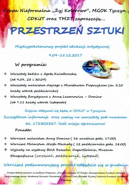 - warsztatach batiku prowadzonych przez Agatę Kwiatkowską w dniach 9, 23 ,30.09.17 r., o godz. 10.00. Miejsce zajęć będzie Centrum Dziedzictwa Kulturowego i Informacji Turystycznej w Tyczynie;