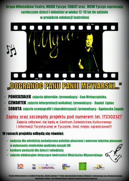 Projekt edukacji teatralnej dla dzieci i młodzieży. Zależy nam na tym by w trochę inny sposób podejść do tematu dziedzictwa kulturowego i pokazać, że to nie tylko „maśniczka” i „cep” ale także dorobek twórców kultury i poetów oraz wszystko to co miało znaczenie dla kultury danego miejsca 50 lat temu. Dlatego chcemy nawiązać do osoby zmarłego Wojciecha Młynarskiego, którego koncert w latach 60 w Tyczynie był wielkim wydarzeniem dla mieszkańców oraz przybliżyć jego twórczość młodemu pokoleniu.