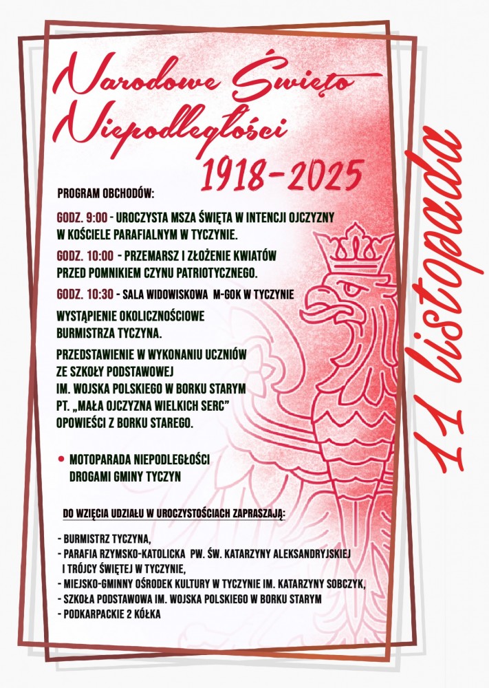 11 LISTOPADA - NARODOWE ŚWIĘTO NIEPODLEGŁOŚCI 1918-2025 DO WZIĘCIA UDZIAŁU W UROCZYSTOŚCIACH ZAPRASZAJĄ: