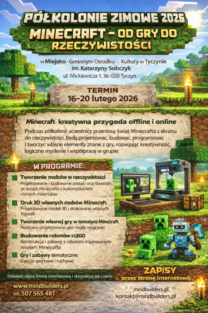 Dzieci przeniosą świat Minecrafta z ekranu do rzeczywistości. Zamiast biernie grać, będą projektować, budować, programować i tworzyć własne rozwiązania – dokładnie tak, jak robią to młodzi twórcy i inżynierowie.
