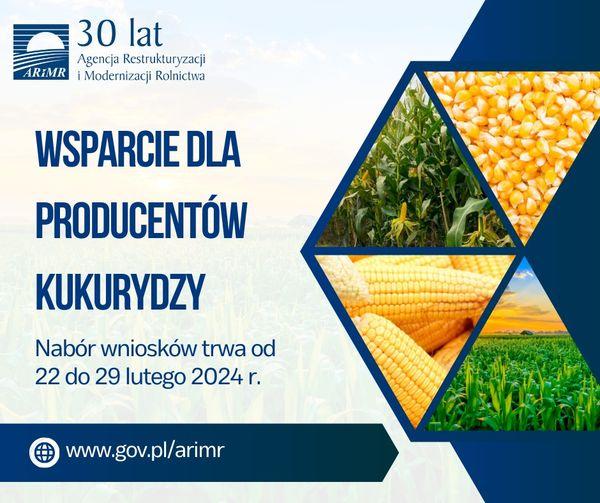 Obrazek Agencja Restrukturyzacji i Modernizacji Rolnictwa w terminie do 29 lutego 2024 r. przyjmuje wnioski o udzielenie pomocy finansowej dla producenta rolnego będącego producentem kukurydzy. więcej
