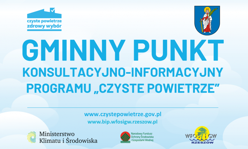 Obrazek Informujemy, że od 1 lipca 2021 r. w Urzędzie Miejskim w Tyczynie rozpoczął swoją działalność Gminny Punkt Konsultacyjno-Informacyjny Programu CZYSTE POWIETRZE. Zwracamy się z prośbą o wcześniejsze ustalenie daty i godziny indywidualnego spotkania pod nr tel. 17 23-04-928 lub 17 23-04-929. więcej