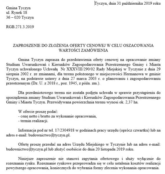 Klauzula informacyjna dotycząca przetwarzania danych osobowych w związku ze sporządzaniem projektu VII zmiany Studium Uwarunkowań i Kierunków Zagospodarowania Przestrzennego Gminy i Miasta Tyczyn oraz rozpatrywaniem wniosków dotyczących studium
