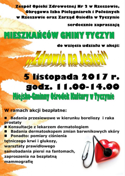 Obrazek Zespół Opieki Zdrowotnej Nr 2 w Rzeszowie, Okręgowa Izba Pielęgniarek i Połoznych w Rzeszowie oraz Zarząd Osiedla w Tyczynie zapraszają mieszkańców Gminy Tyczyn do wzięcia udziału w akcji "Zdrowie na jesień" więcej