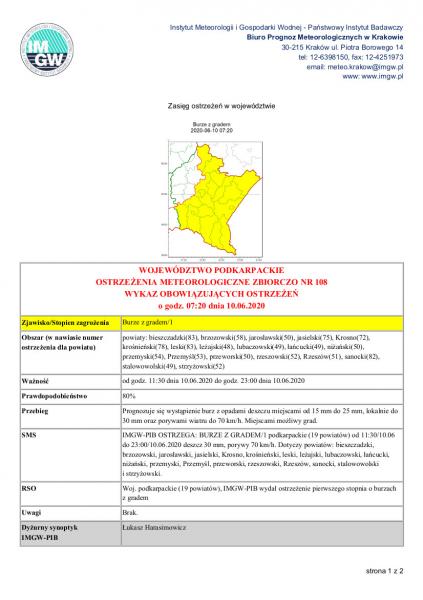 OSTRZEŻENIA METEOROLOGICZNE ZBIORCZO NR 108