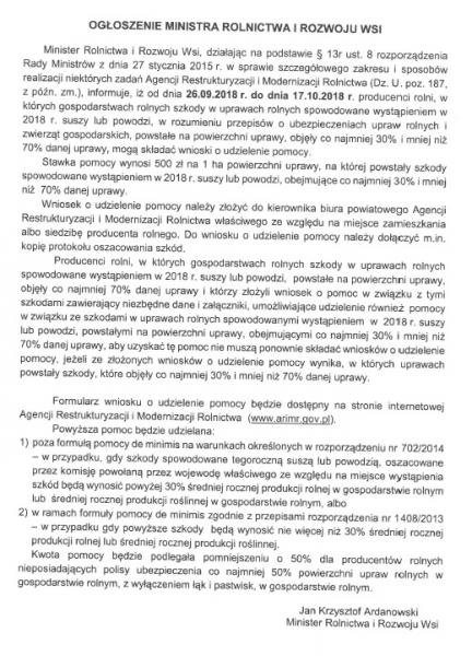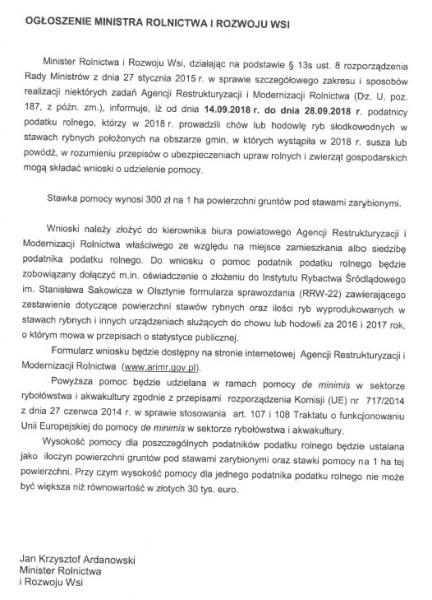Ogłoszenia Ministra Rolnictwa i Rozwoju Wsi informujące o uruchomieniu pomocy dla producentów rolnych oraz podatników podatku rolnego, którzy w 2018 r. prowadzili chów lub hodowlę ryb słodkowodnych w stawach rybnych, którzy w bieżącym roku zostali poszkodowani w wyniku suszy lub powodzi.