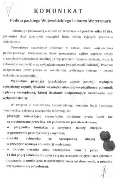 Informujemy o planowanej w terminie 9 - 18 listopada 2018 r. dodatkowej akcji szczepień lisów wolno żyjących przeciwko wściekliźnie.