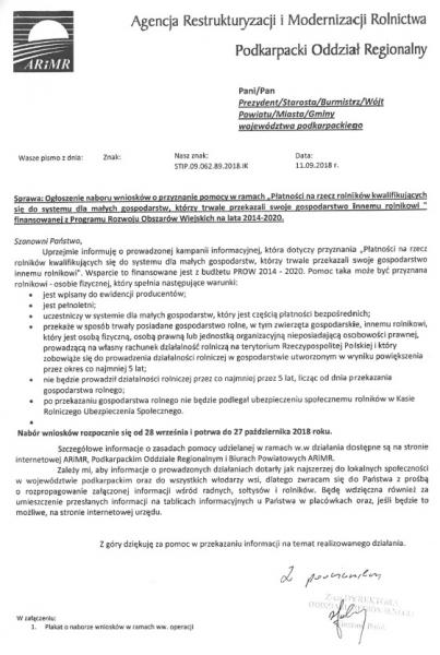Ogłoszenie naboru wniosków o przyznanie pomocy w ramach ,,Płatności na rzecz rolników kwalifikujących się do systemu dla małych gospodarstw, którzy trwale przekazali swoje gospodarstwo innemu rolnikowi’’ finansowanej z Programu Rozwoju Obszarów Wiejskich na lata 2014-2020.