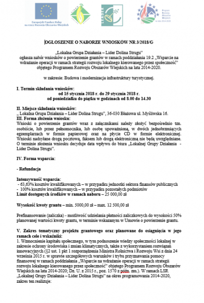 „Lokalna Grupa Działania – Lider Dolina Strugu” ogłasza nabór wniosków o powierzenie grantów w ramach poddziałania 19.2 „Wsparcie na wdrażanie operacji w ramach strategii rozwoju lokalnego kierowanego przez społeczność” objętego Programem Rozwoju Obszarów Wiejskich na lata 2014-2020. w zakresie: Budowa i modernizacja infrastruktury turystycznej.