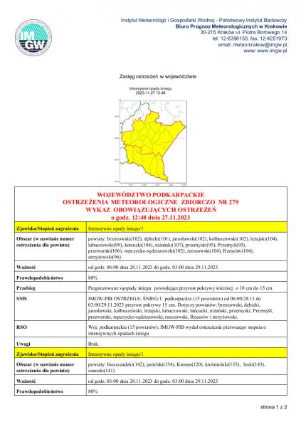 OSTRZEŻENIA METEOROLOGICZNE ZBIORCZO NR 279