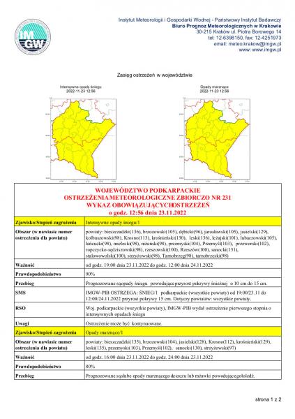 OSTRZEŻENIA METEOROLOGICZNE ZBIORCZO NR 231