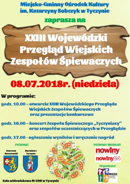 Miejsko-Gminny Ośrodek Kultury im. Katarzyny Sobczyk w Tyczynie zaprasza na XXIII Wojewódzki Przegląd Wiejskich Zespołów Śpiewaczy