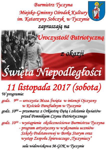 11 listopada br. oficjalne uroczystości z okazji Narodowego Święta Niepodległości rozpoczęła msza św. w tyczyńskim kościele parafialnym odprawiona w intencji Ojczyzny. W nabożeństwie udział wzięły władze samorządowe z Burmistrzem Tyczyna Januszem Skotnickim i Przewodniczącym Rady Miejskiej w Tyczynie Adamem Skowrońskim na czele, dyrektorzy placówek oświatowych, instytucji, stowarzyszeń, Orlęta, Strzelcy oraz mieszkańcy Tyczyna i okolic.