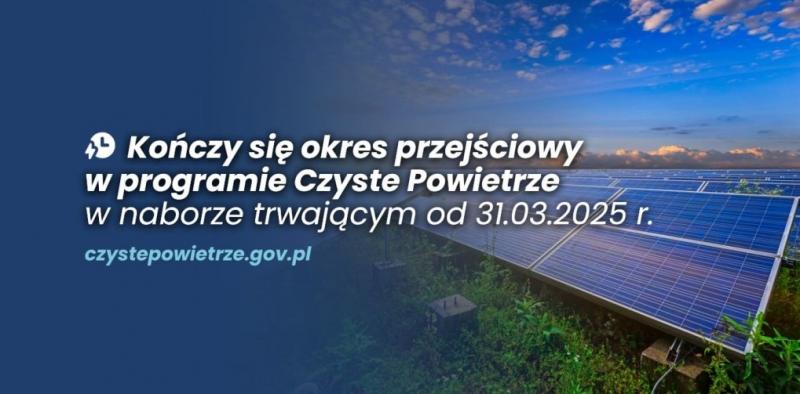 Przypominamy, że do 31 sierpnia 2025 r. trwa okres przejściowy w programie Czyste Powietrze. To ostatnia szansa, by złożyć wniosek o dofinansowanie na inwestycje rozpoczęte po 28 maja 2024 r., które nie zostały zgłoszone przed zawieszeniem programu w listopadzie ubiegłego roku.