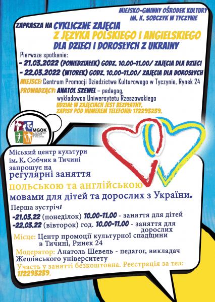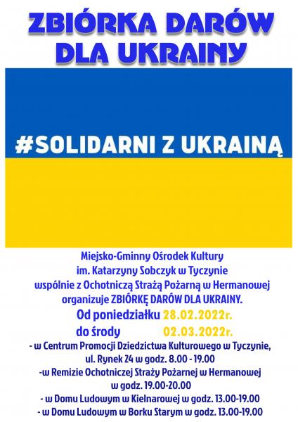 Obrazek Od poniedziałku do środy wspólnie z Ochotnicza Straż Pożarna w Hermanowej organizujemy ZBIÓRKĘ DARÓW DLA UKRAINY. Do Zbiórki Darów dla Ukrainy dołączył się Miejsko-Gminny Ośrodek Kultury im. Katarzyny Sobczyk w Tyczynie.  więcej