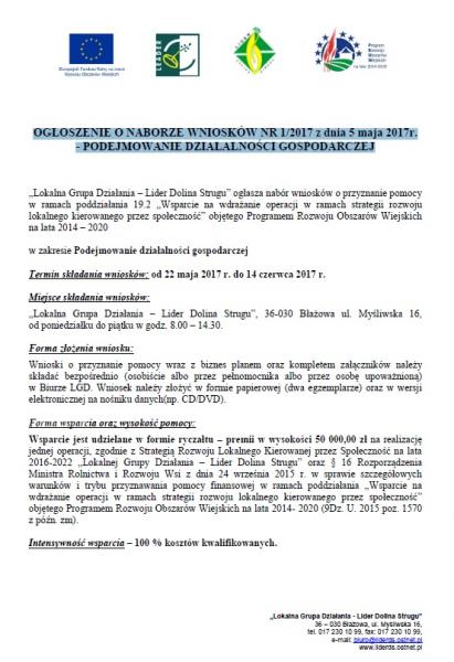 OGŁOSZENIE O NABORZE WNIOSKÓW NR 2/2017