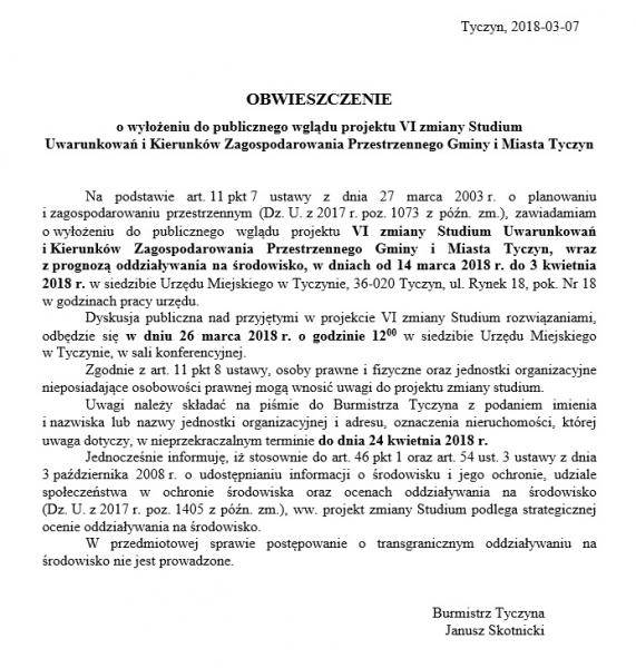Na podstawie art. 11 pkt 7 ustawy z dnia 27 marca 2003 r. o planowaniu i zagospodarowaniu przestrzennym (Dz. U. z 2017 r. poz. 1073 z późn. zm.), zawiadamiam o wyłożeniu do publicznego wglądu projektu VI zmiany Studium Uwarunkowań i Kierunków Zagospodarowania Przestrzennego Gminy i Miasta Tyczyn, wraz z prognozą oddziaływania na środowisko, w dniach od 14 marca 2018 r. do 3 kwietnia 2018 r. w siedzibie Urzędu Miejskiego w Tyczynie, 36-020 Tyczyn, ul. Rynek 18, pok. Nr 18 w godzinach pracy urzędu.