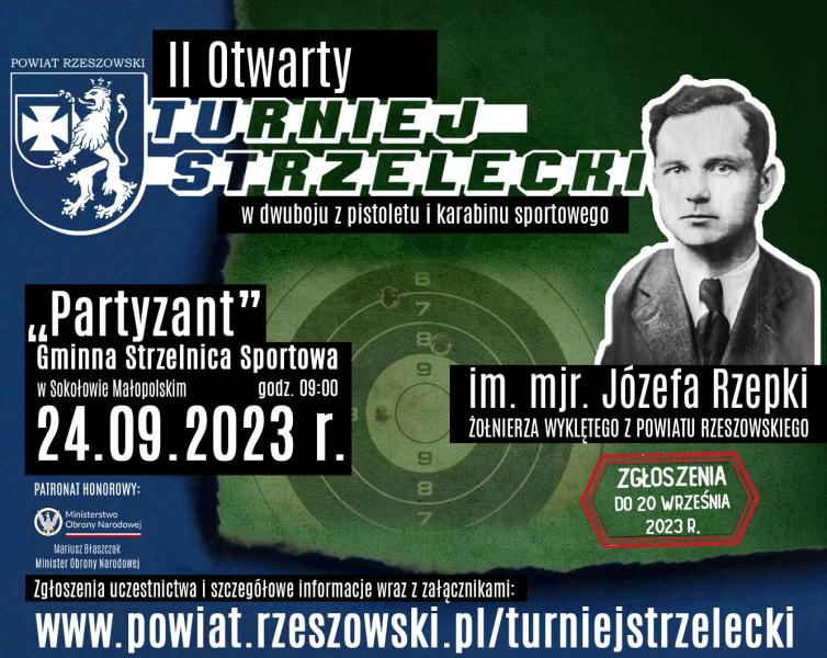 Zapraszamy do udziału w organizowanym przez Powiat Rzeszowski, w dniu 24 września 2023 r., II Otwartym Turnieju Strzeleckim im. Majora Józefa Rzepki. Wydarzenie to upamiętnia wywodzącego się z terenu powiatu rzeszowskiego Żołnierza Wyklętego, zamordowanego w 1951 r. z wyroku komunistycznego sądu. Turniej będzie miał charakter cykliczny. Przedsięwzięcie to ma na celu doskonalenie umiejętności strzeleckich oraz kształtowanie postaw miłości Ojczyzny i zostało objęte patronatem honorowym Mariusza Błaszczaka Ministra Obrony Narodowej. Odbędzie się na Strzelnicy Gminnej „Partyzant” w Sokołowie Młp. Zawody odbywać się będą w trzech kategoriach: dla dzieci i młodzieży, dla kobiet oraz dla mężczyzn. Zawodnicy będą rywalizować w dwuboju z pistoletu i karabinu sportowego.
