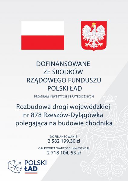 Rządowy Fundusz Polski Ład: Program Inwestycji Strategicznych ma na celu dofinansowanie projektów inwestycyjnych realizowanych przez gminy, powiaty i miasta lub ich związki w całej Polsce. Wsparcie ma charakter bezzwrotny. W ramach drugiej edycji tego programu Gmina Tyczyn łącznie otrzymała dofinansowanie w kwocie 5 082 459,43 zł. Środki te rozdysponowane zostały na trzy zadania, jednym z nich jest zadanie pn. „Rozbudowa drogi wojewódzkiej nr 878 Rzeszów-Dylągówka polegająca na budowie chodnika”, na który wydzielono kwotę w wysokości 2 582 199,30 zł, co stanowi 95% całej wartości inwestycji. Planowana data zakończenia Inwestycji to ostatni kwartał 2023 roku.